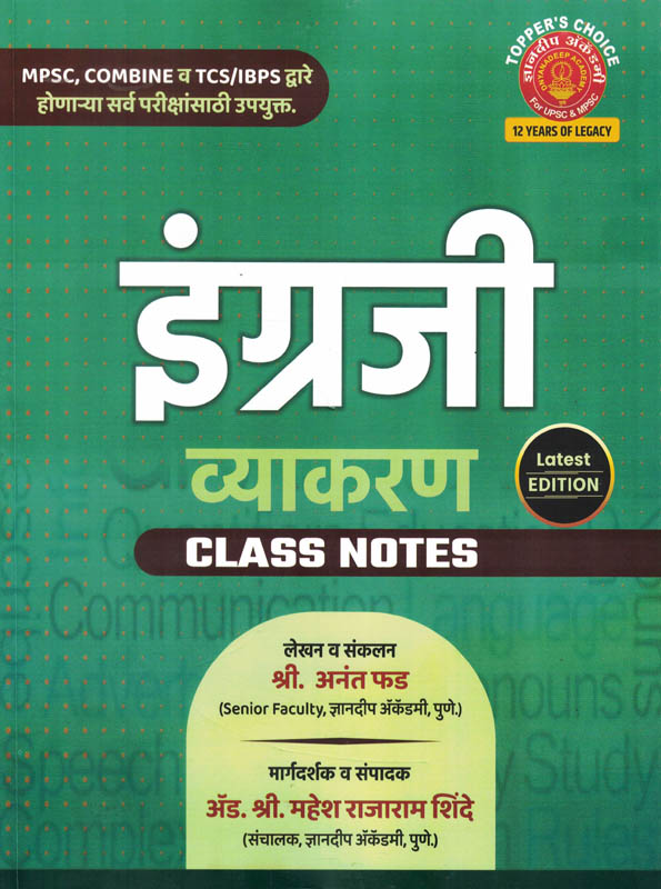 The “English Vyakaran Class Notes” published by Dnyandeep Academy and authored by Anant Fad and Mahesh Shinde is a specialized study guide designed for competitive exams in Maharashtra, such as MPSC (State Services), Combine Group B & C, and Saralseva.